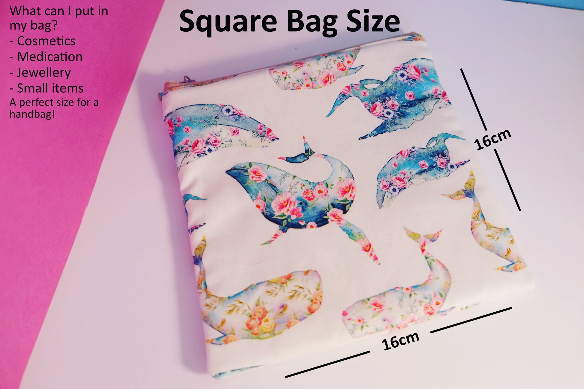 The dimensions of the bag are roughly 16cm x 16cm. As each bag is handmade, there may be slight variations in size and the colours in the fabrics may appear slightly different.